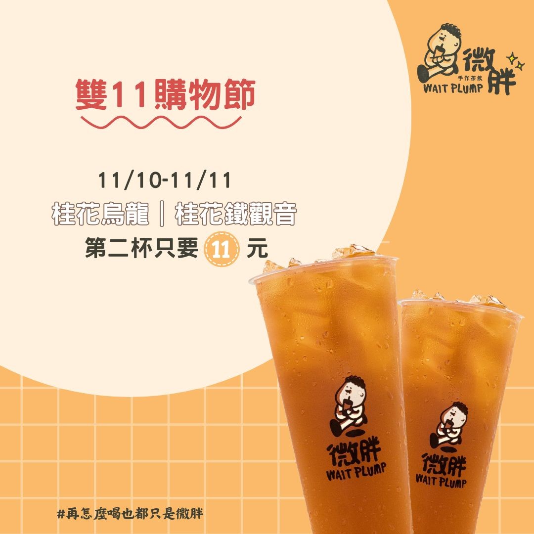 🎉歡慶雙11,指定品項第二杯11元🎉什麼!第二杯竟然只要11元!雙11購物買太累了,還不趕快來一杯微胖休息一下~